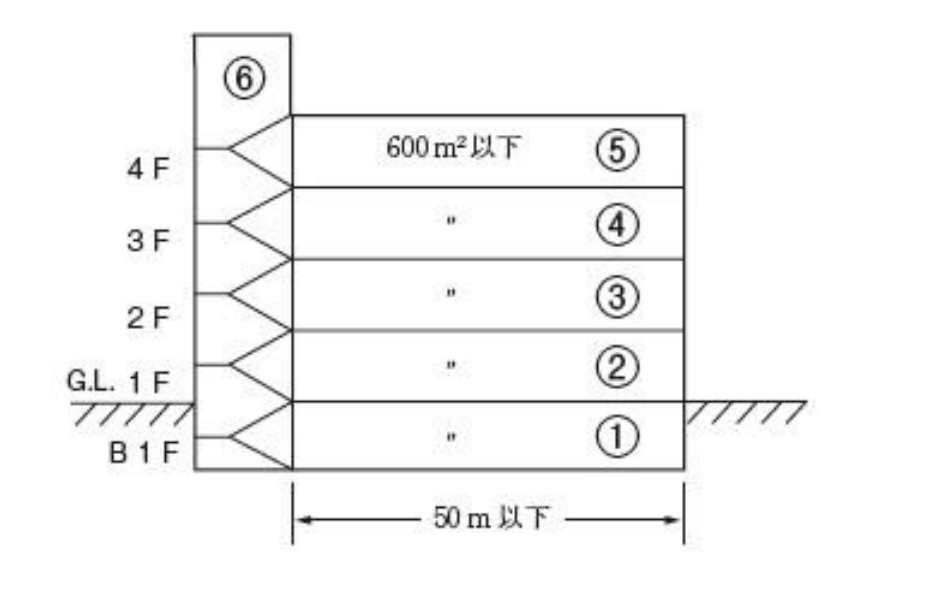 しかし、これには例外があります。上図(左)をご覧ください。各階の長さが50m以下で1つのフロアの面積がそれぞれ250㎡以下の場合、1階と2階を合わせて②としています(地下は1の警戒区域となる)。これは先の改正で一つの階の面積が500平米以下であれば2階と合わせて1つの警戒区域とすることができるような例外規定が設けられたためです。