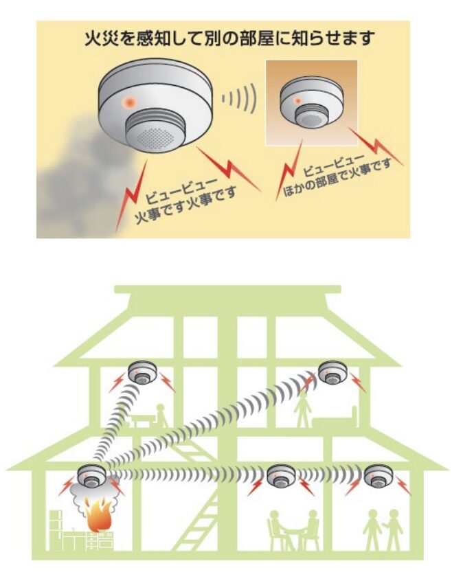 一方、特小自火報は無線式の連動型警報機能付感知器のみで構成することができます。感知器同士が無線で連動し、一つの感知器が火災を感知すると、建物内のすべての感知器が警報を鳴らす仕組みです。